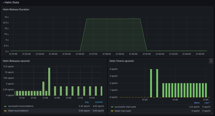 The Flux monitoring stack comes with two dashboards for easy visualization of Flux controllers and resource metrics. You can follow this link to learn how to set it up.